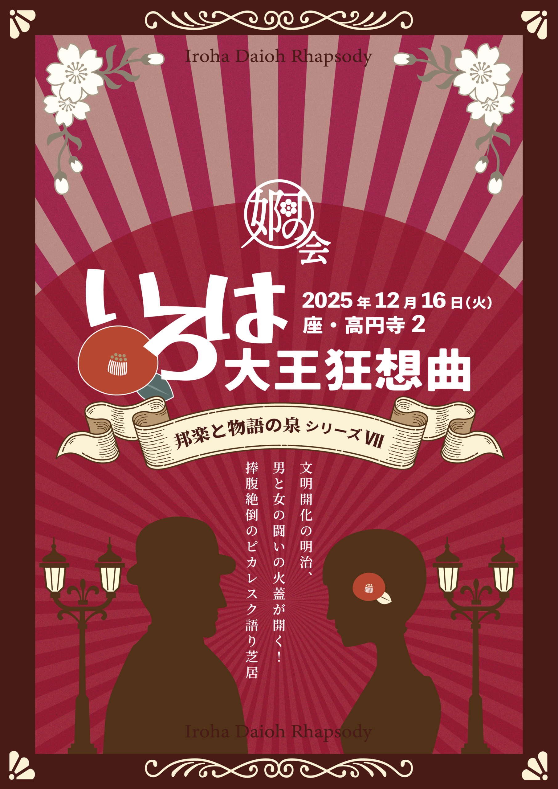 【制作実績】婀の会 邦楽と物語の泉シリーズⅦ『いろは大王狂想曲』チラシデザイン 2025 9/04 宣伝美術 2025年9月4日 【制作実績】婀の会 邦楽と物語の泉シリーズⅦ『いろは大王狂想曲』チラシデザインを担当しました。公演は、2025年12月16日(火)座・高円寺2で上演です。ぜひご覧ください。 宣伝美術 【制作実績】新国立劇場『焼肉ドラゴン』SNS用動画 【制作実績】劇団Philos.第四回公演 『フロートマン』チラシデザイン 関連記事 【制作実績】劇団Philos.第四回公演 『フロートマン』チラシデザイン 2025年11月6日 【制作実績】花組芝居『陽炎座』宣伝美術・撮影協力 2025年8月23日 【制作実績】花組芝居 花組ヌーベル ミュージカル『平家蟹』宣伝美術 2025年5月31日